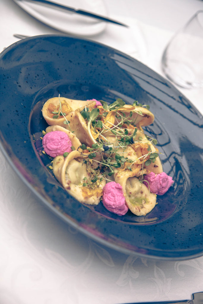 Domáce cappellatti, žihlava, ricotta, pistácie, d’atelinka,