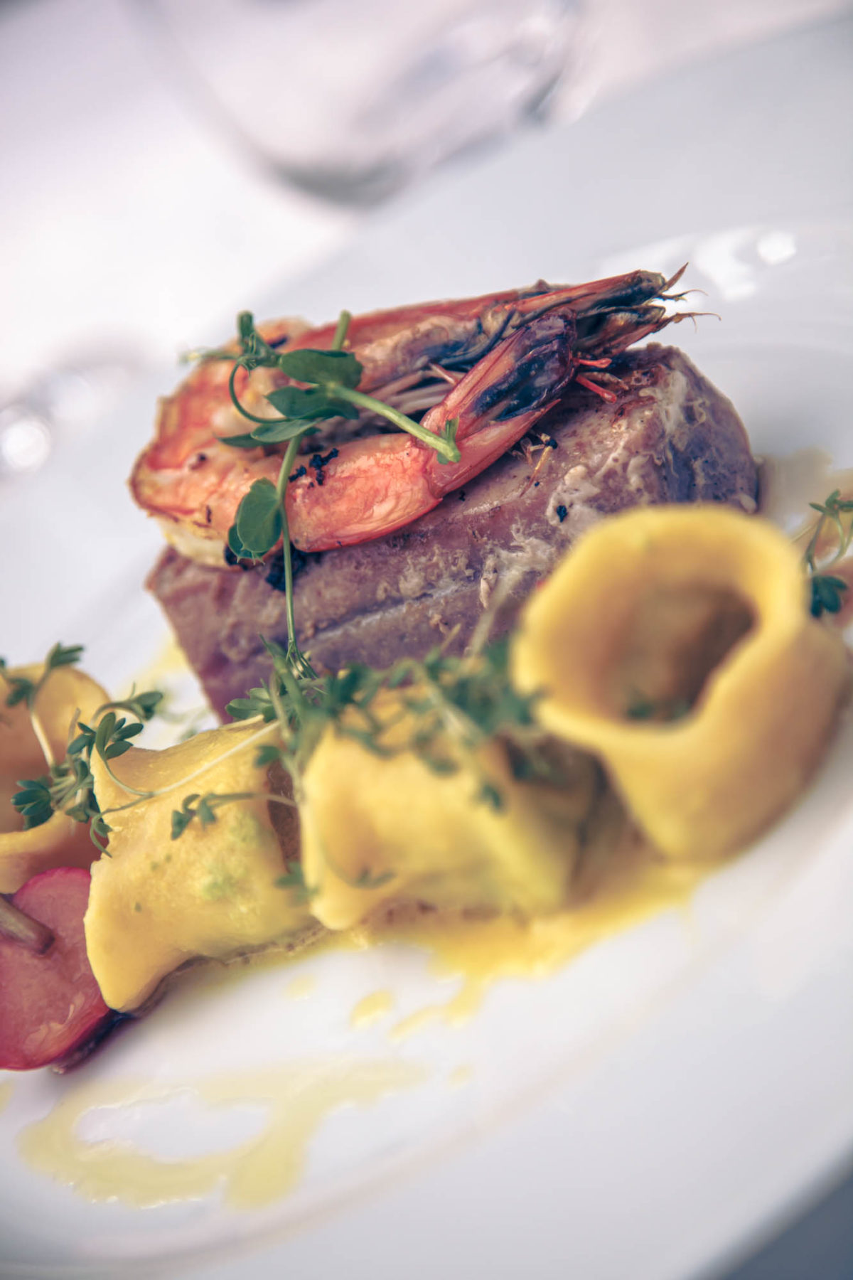 Filet z tuniaka, kreveta, tortellini plnene hráškom
